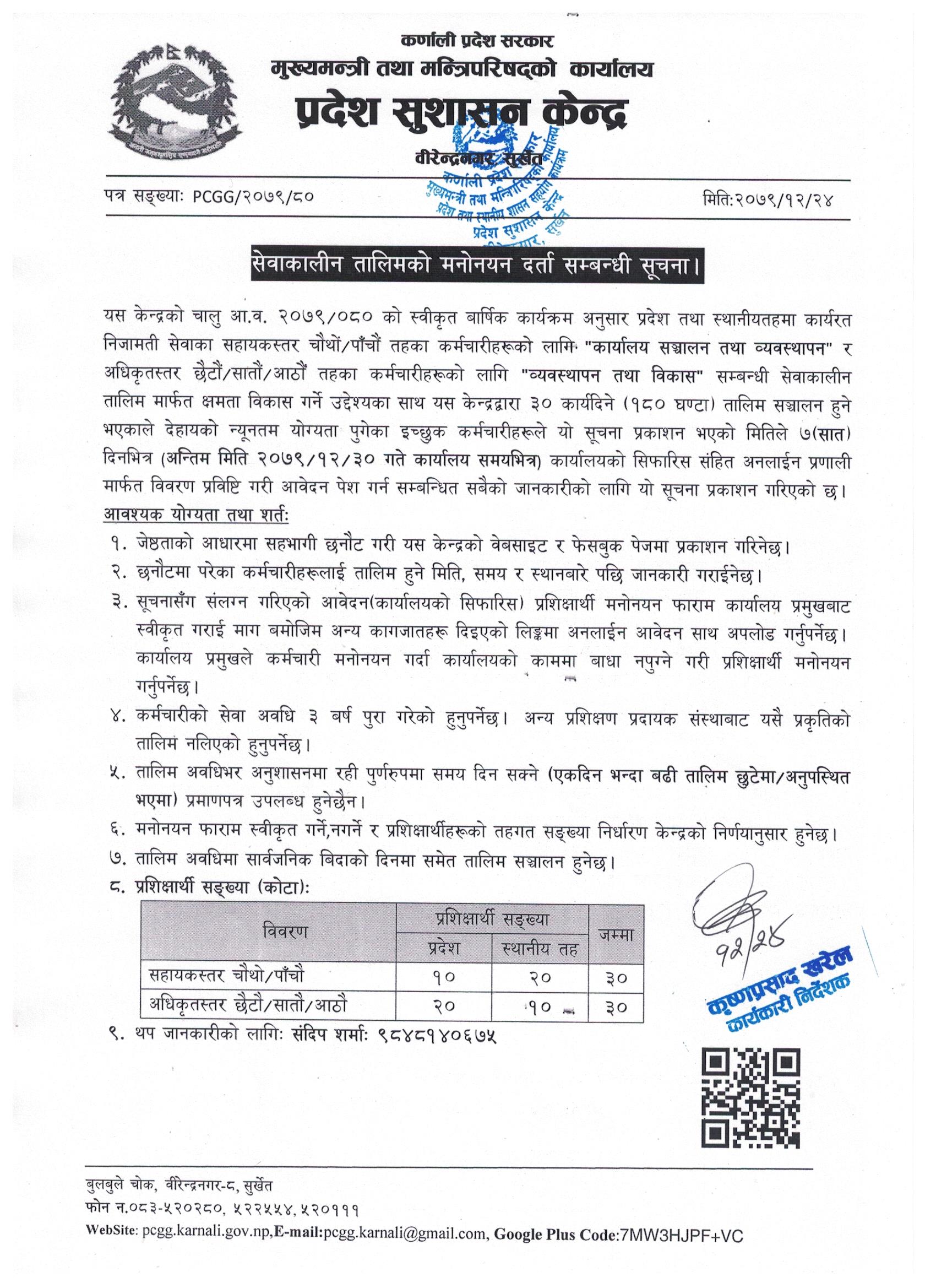 * प्रदेश तथा स्थानीयतहमा कार्यरत अधिकृतस्तर छैटौं/सातौं/आठौं तहका निजामती कर्मचारीहरुको लागि ३० कार्यदिने सेवाकालीन तालिमको मनोनयन दर्ता सम्बन्धी सूचना